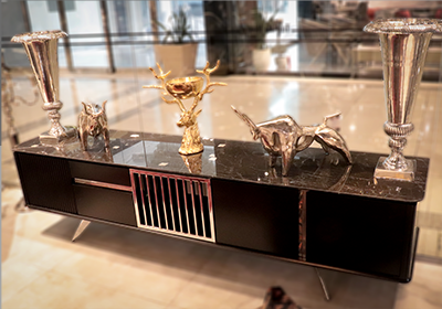 سنگ روی میزها سنگ مارشال مشکی با رگه های طلایی و نباتی کارشده است.